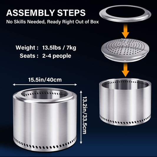 HGD 15.5" Smokeless Fire Pit Outdoor, Stainless Steel Wood Burning Firepit with Secondary Combustion, Backyard Patio Stove for Garden, BBQ & Bonfire